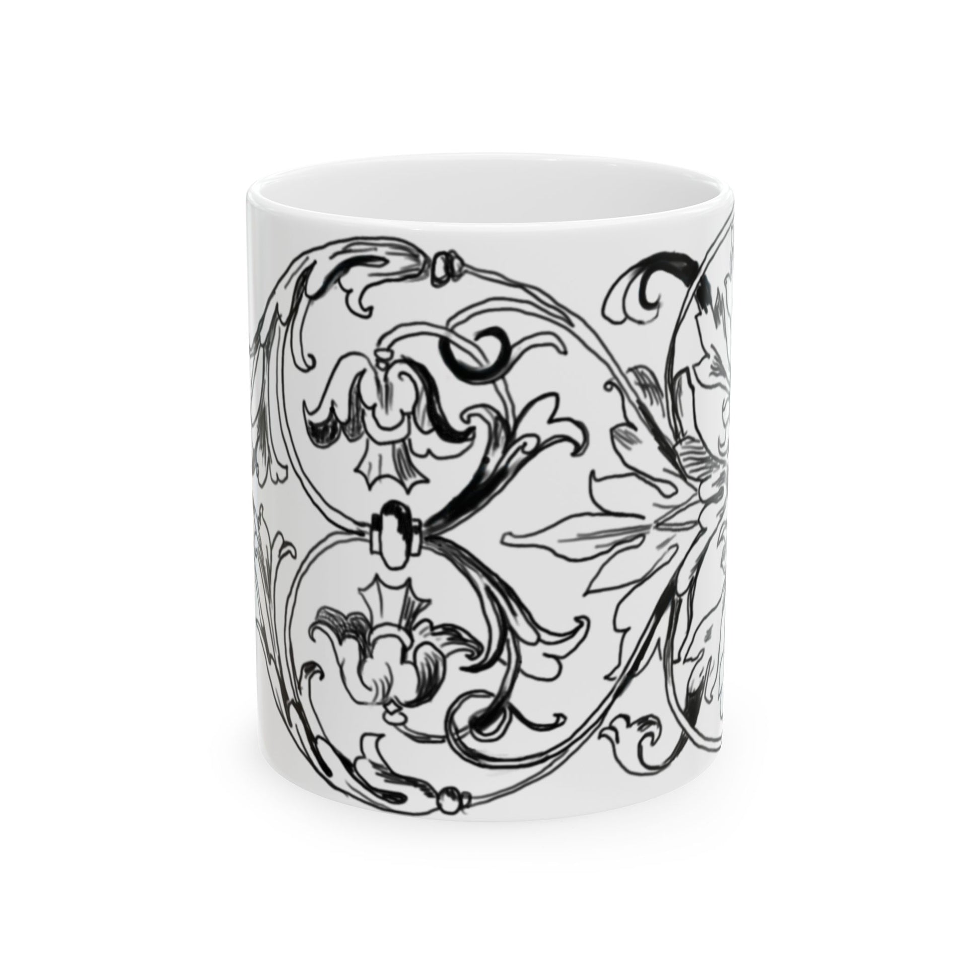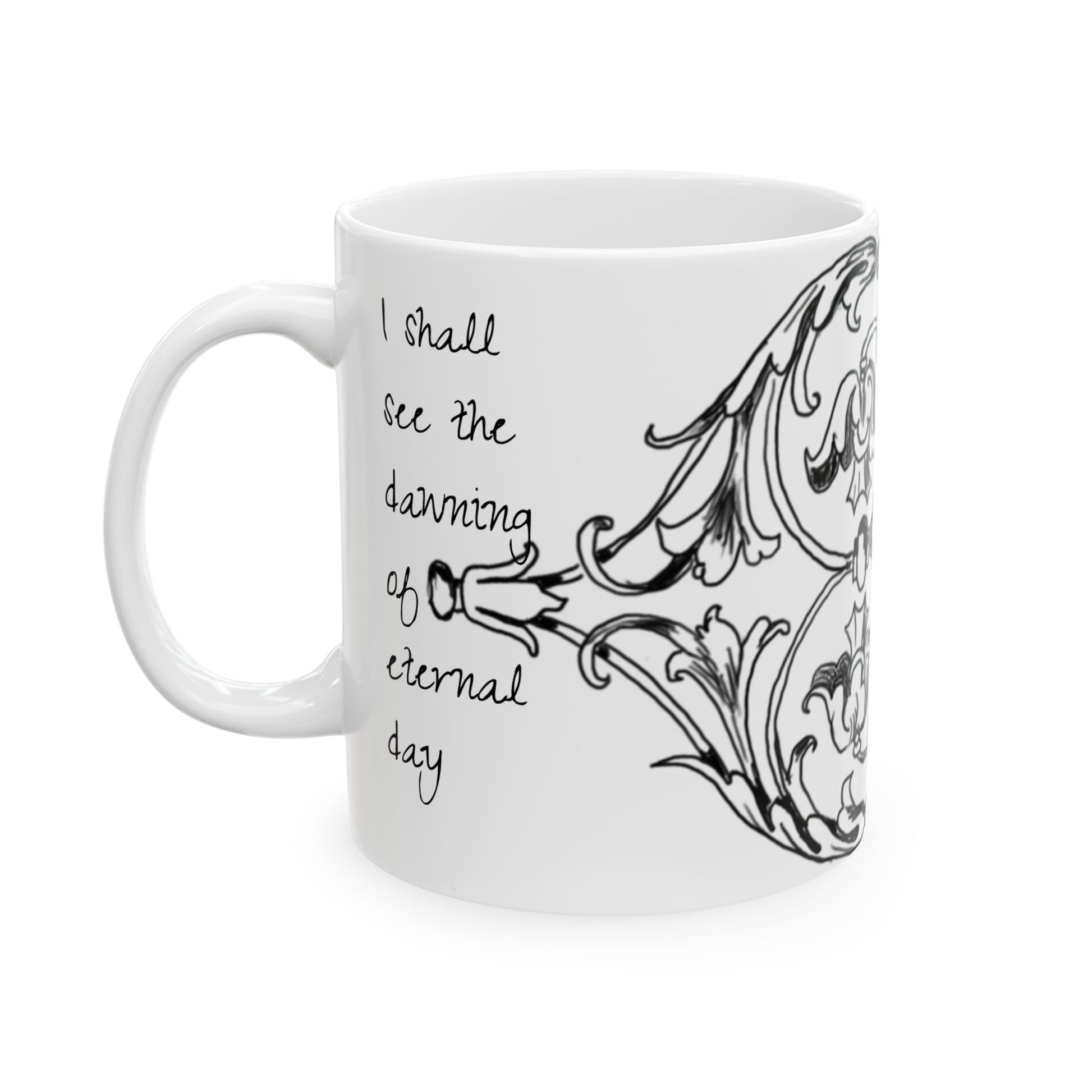 Scrollwork Ceramic Mug Black and White, "I shall see dawning..."