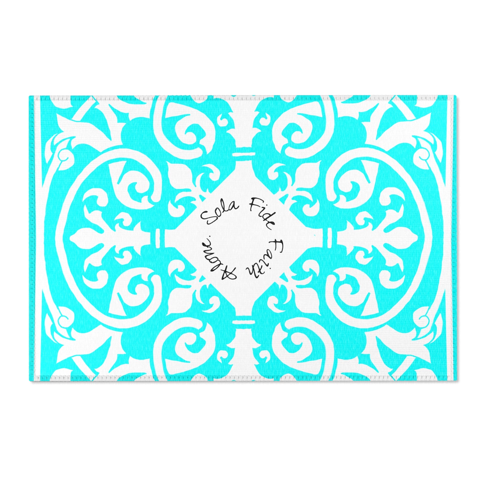 Scrollwork Indoor/Outdoor Rug Aqua "Sola Fide..."