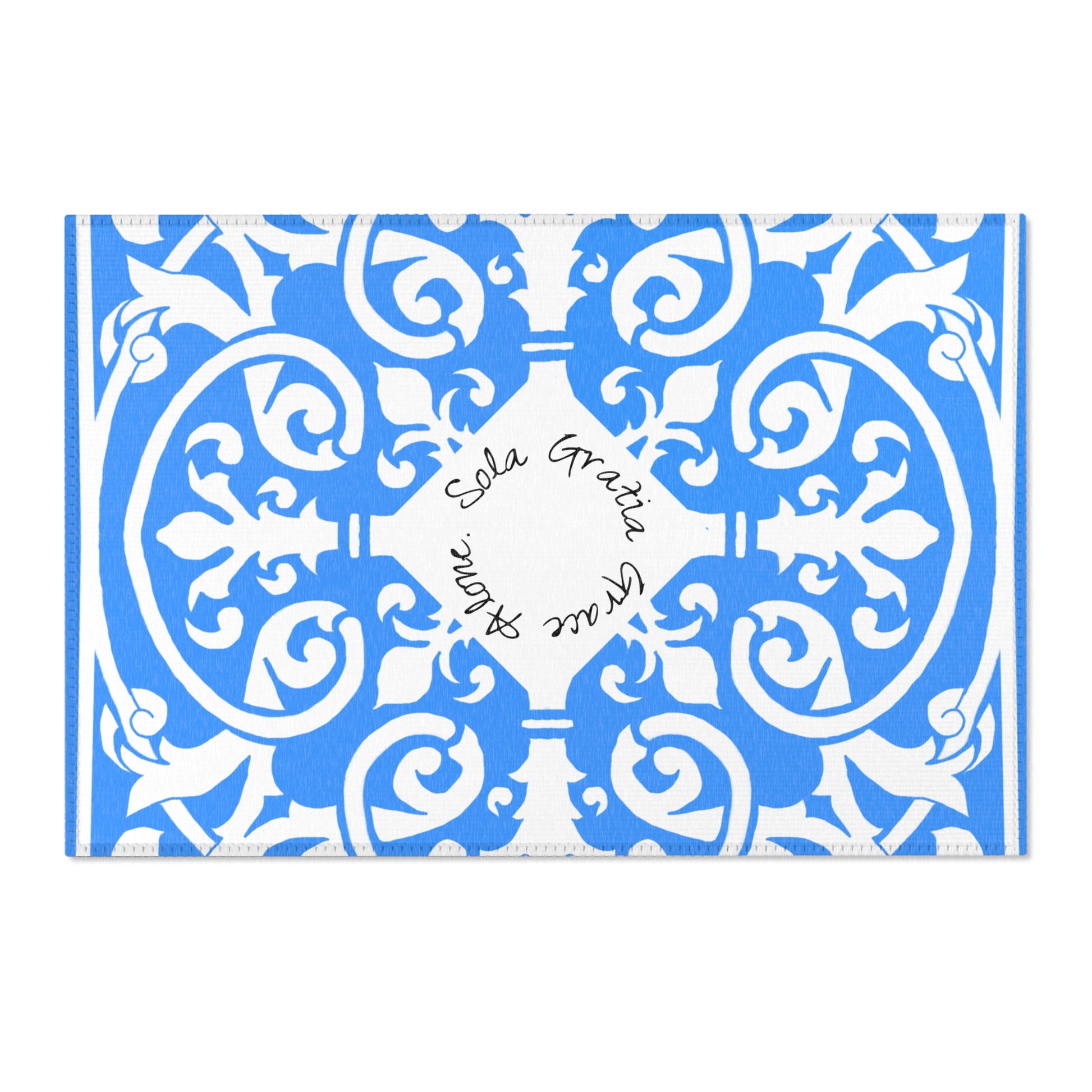 Scrollwork Indoor/Outdoor Rug Blue "Sola Gratia..."