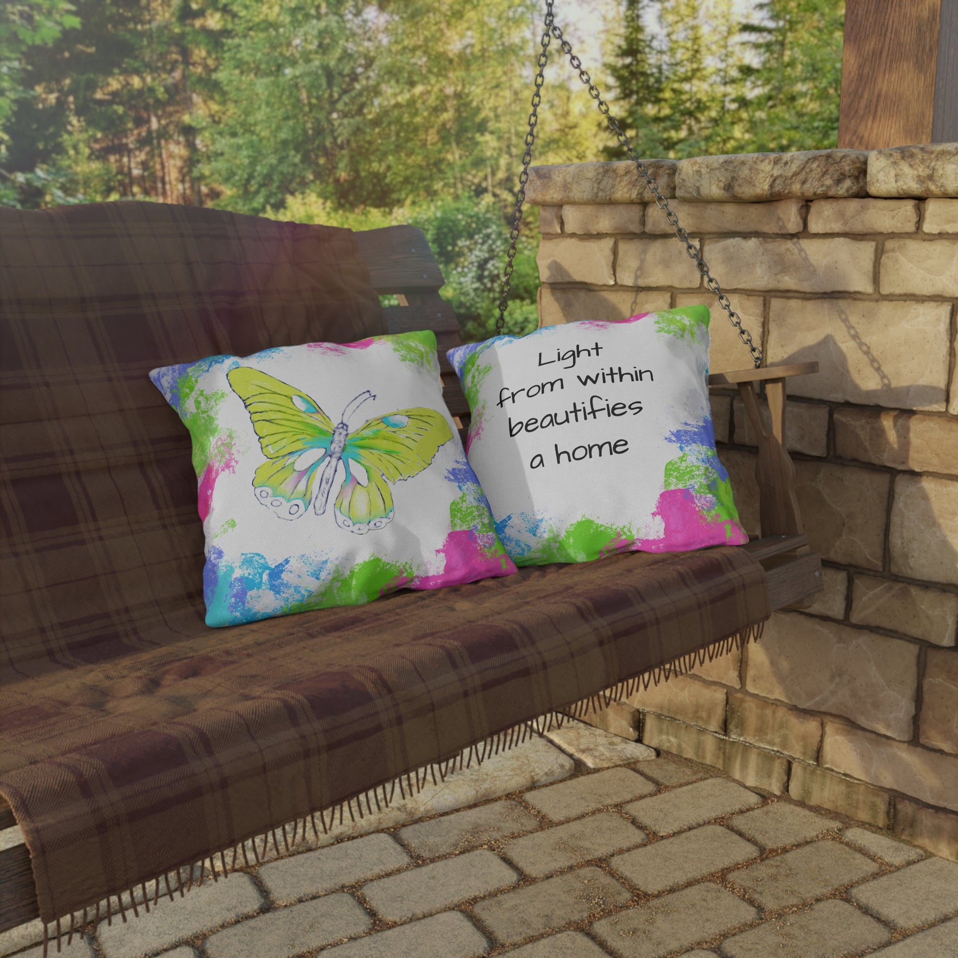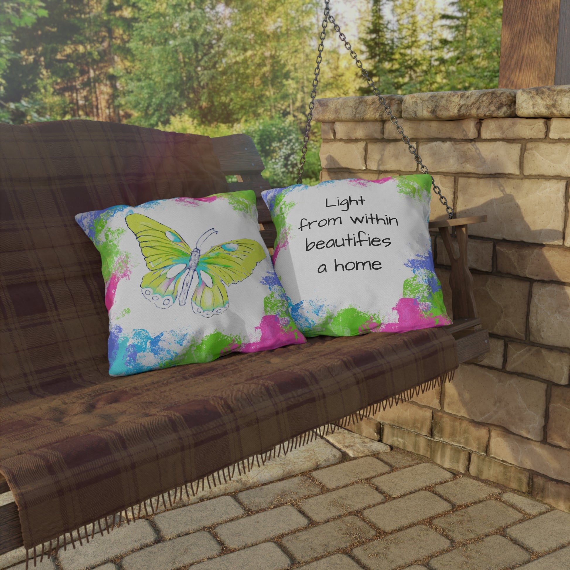 The simple beauty of a hand-drawn butterfly brings a breath of peace to your outdoor space. Whether resting on a porch swing, nestled into a garden chair, or placed by the door to greet you with joy, this pillow offers both charm and encouragement.