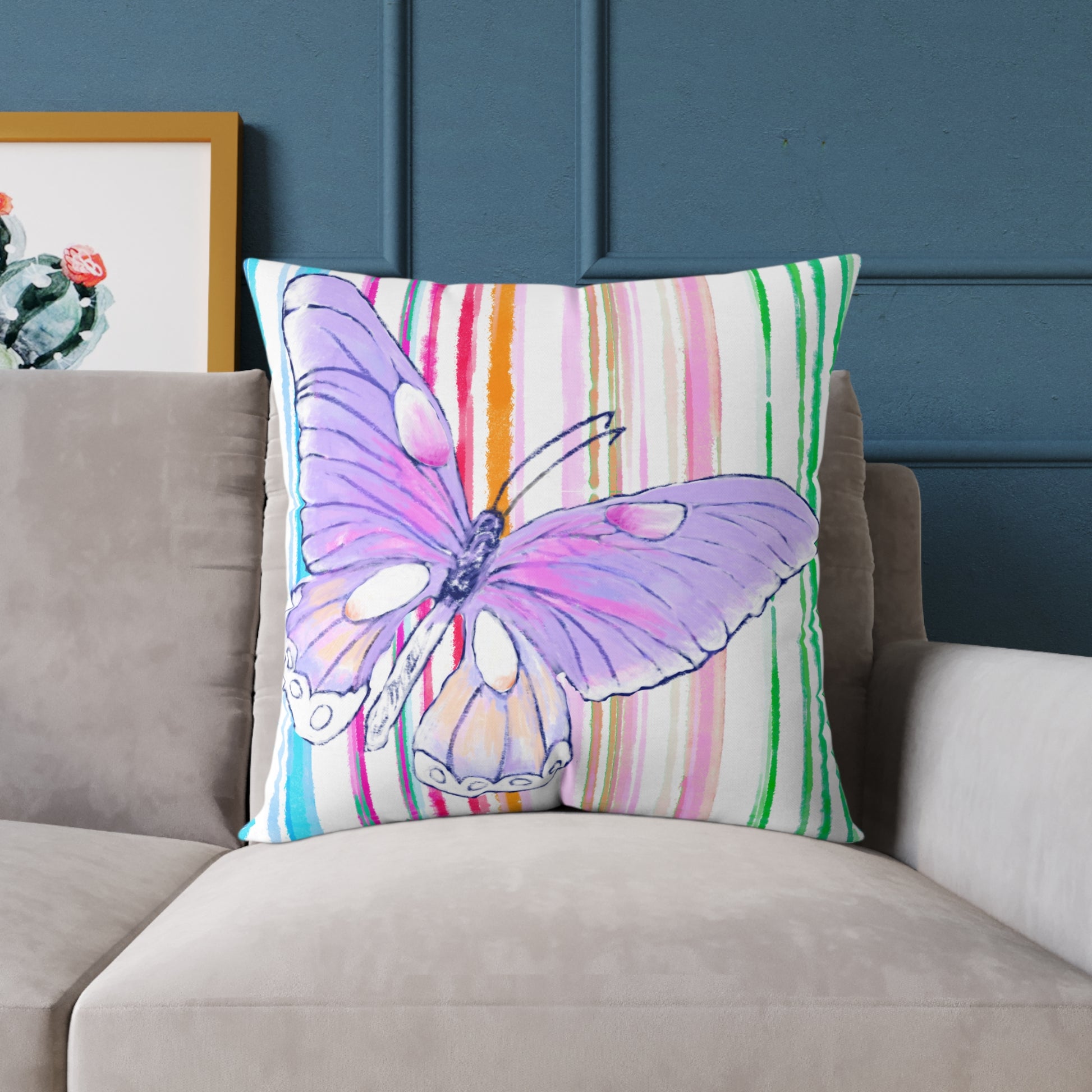 Let your home bloom with the quiet wonder of hand-drawn butterflies by local artist Joel, gently entangled in a tangle of color and movement. One side of this pillow features soft watercolor stripes, the other a whimsical gathering of butterflies in flight—designed to bring cheer, color, and calm to your most cherished spaces.
