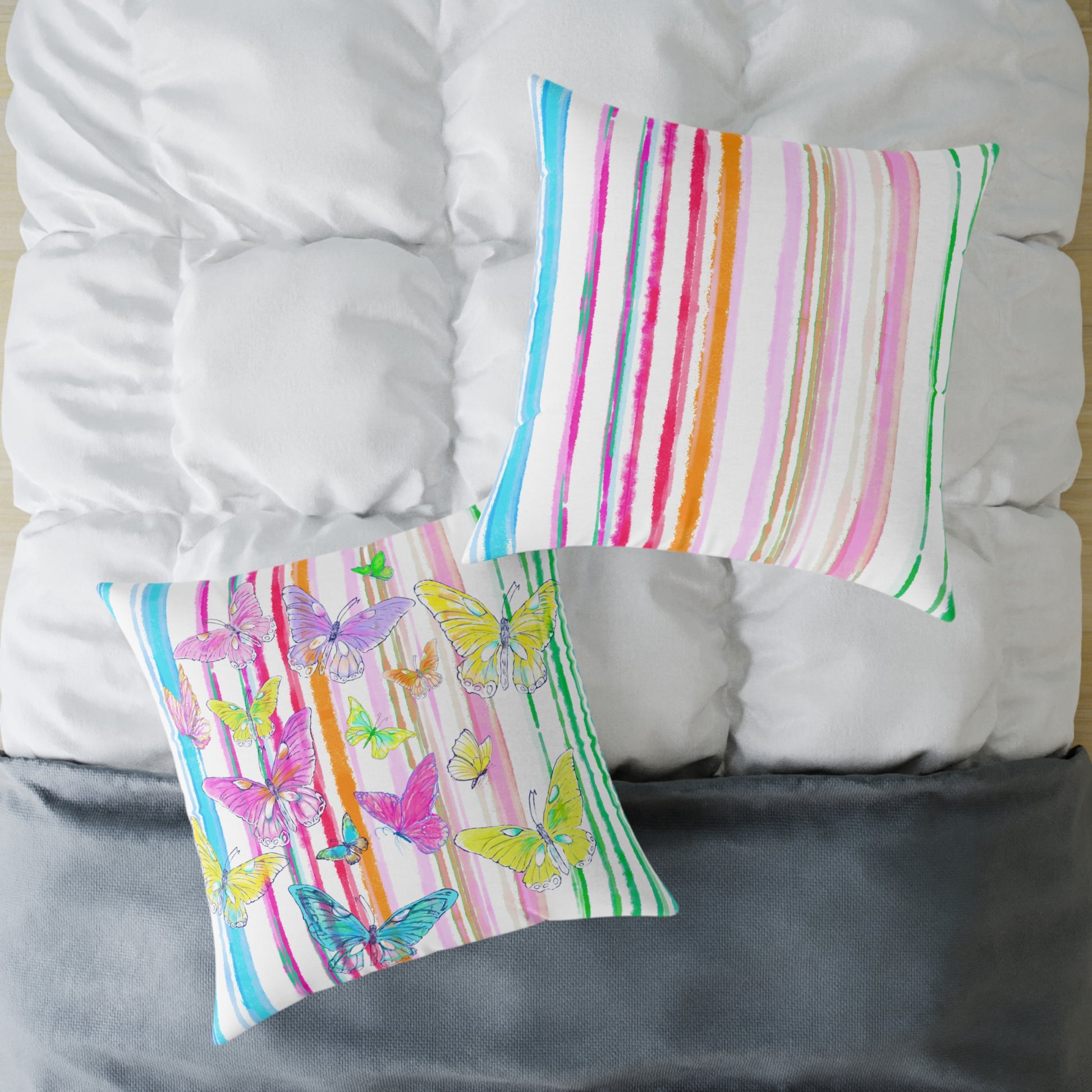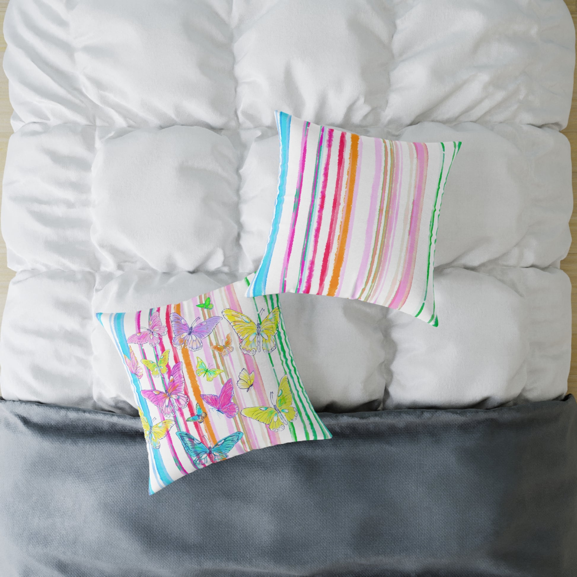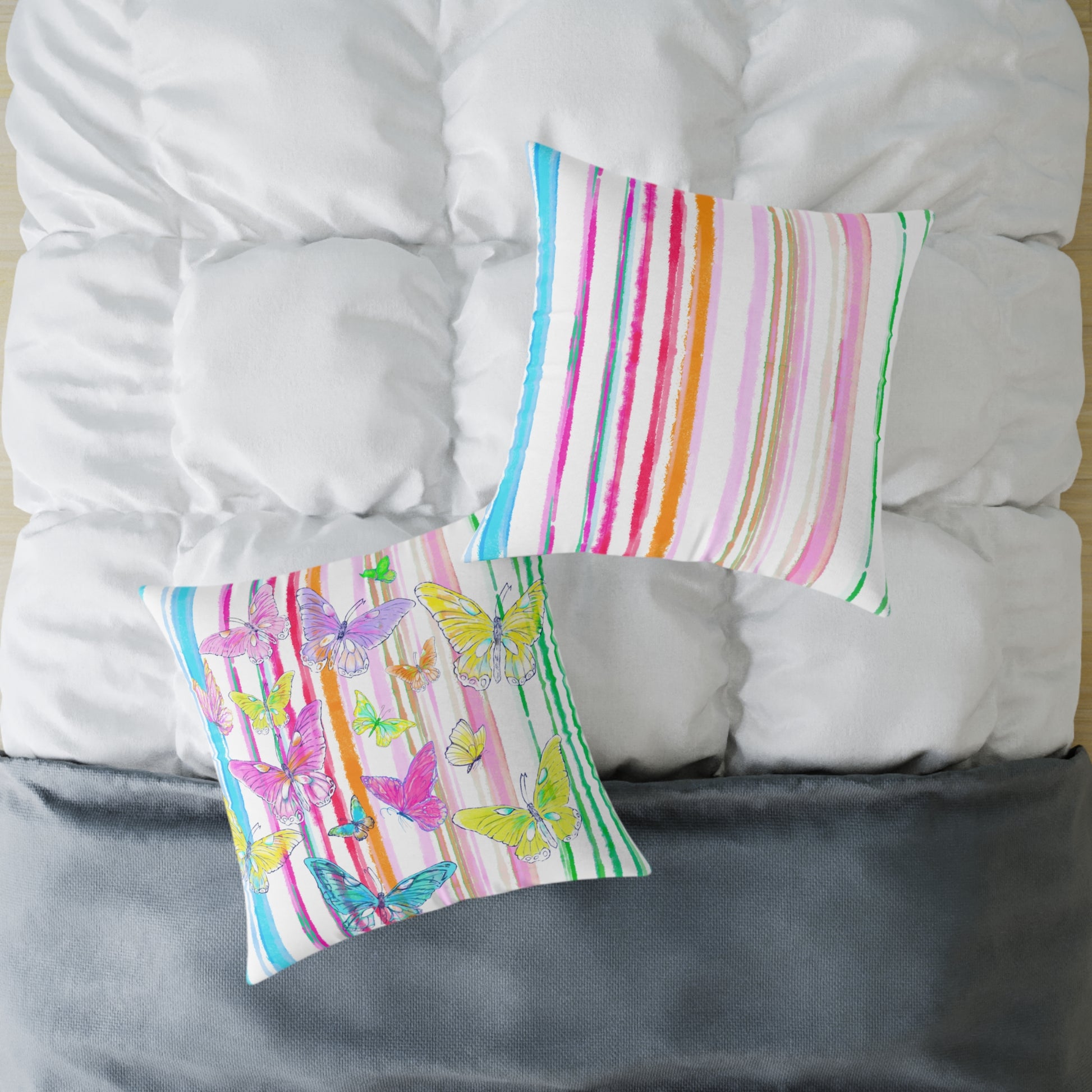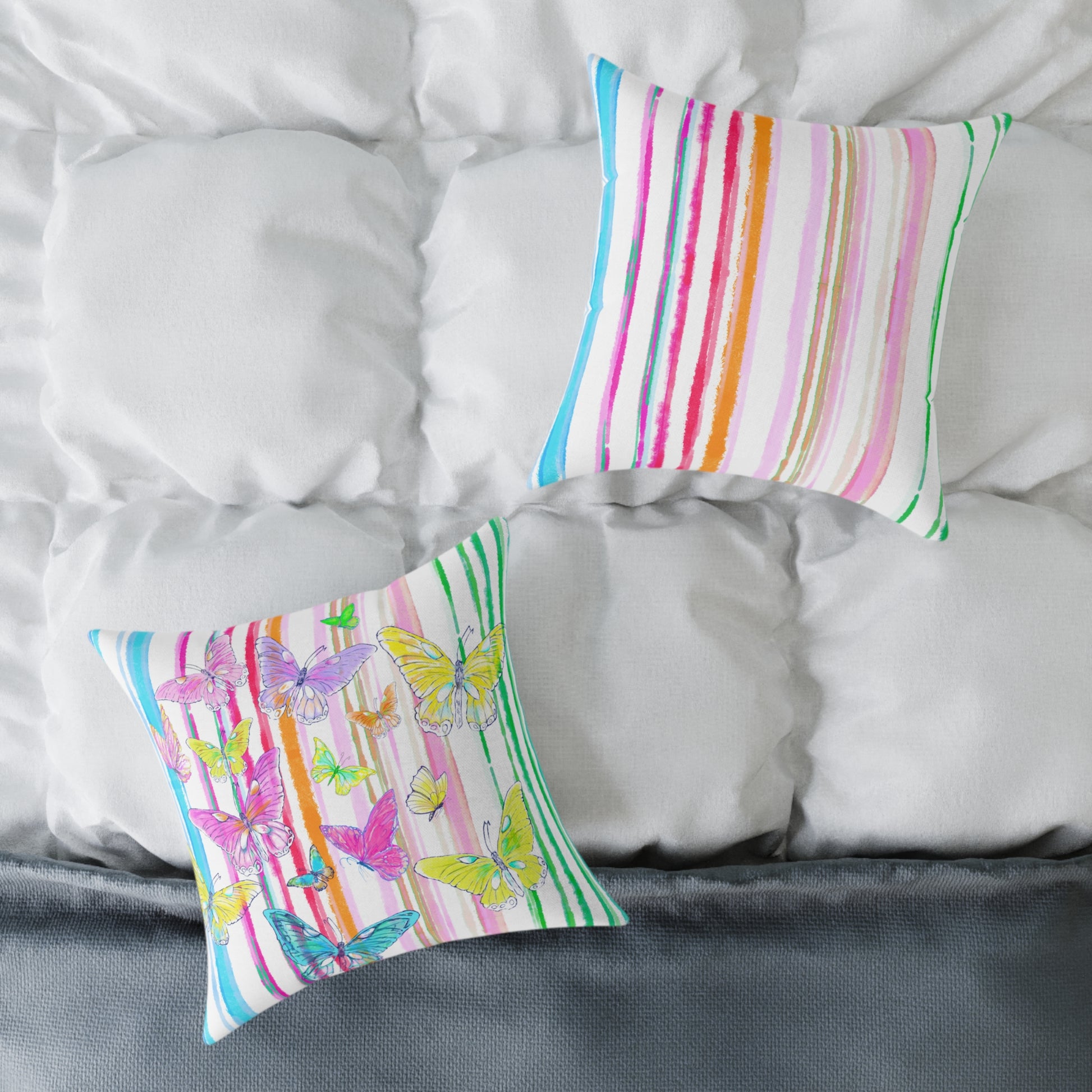 Let your home bloom with the quiet wonder of hand-drawn butterflies by local artist Joel, gently entangled in a tangle of color and movement. One side of this pillow features soft watercolor stripes, the other a whimsical gathering of butterflies in flight—designed to bring cheer, color, and calm to your most cherished spaces.