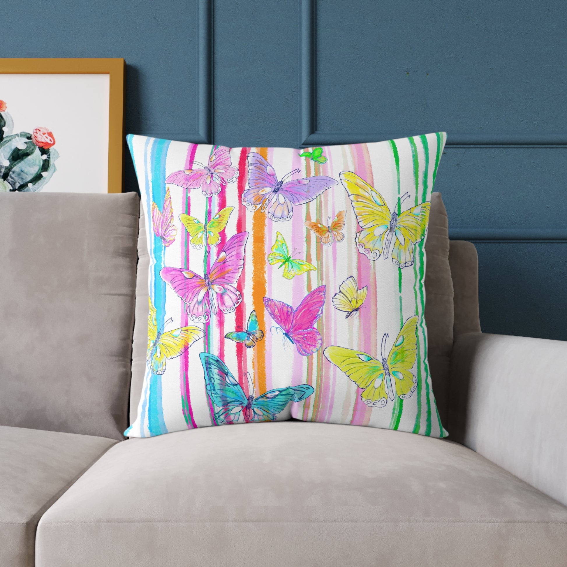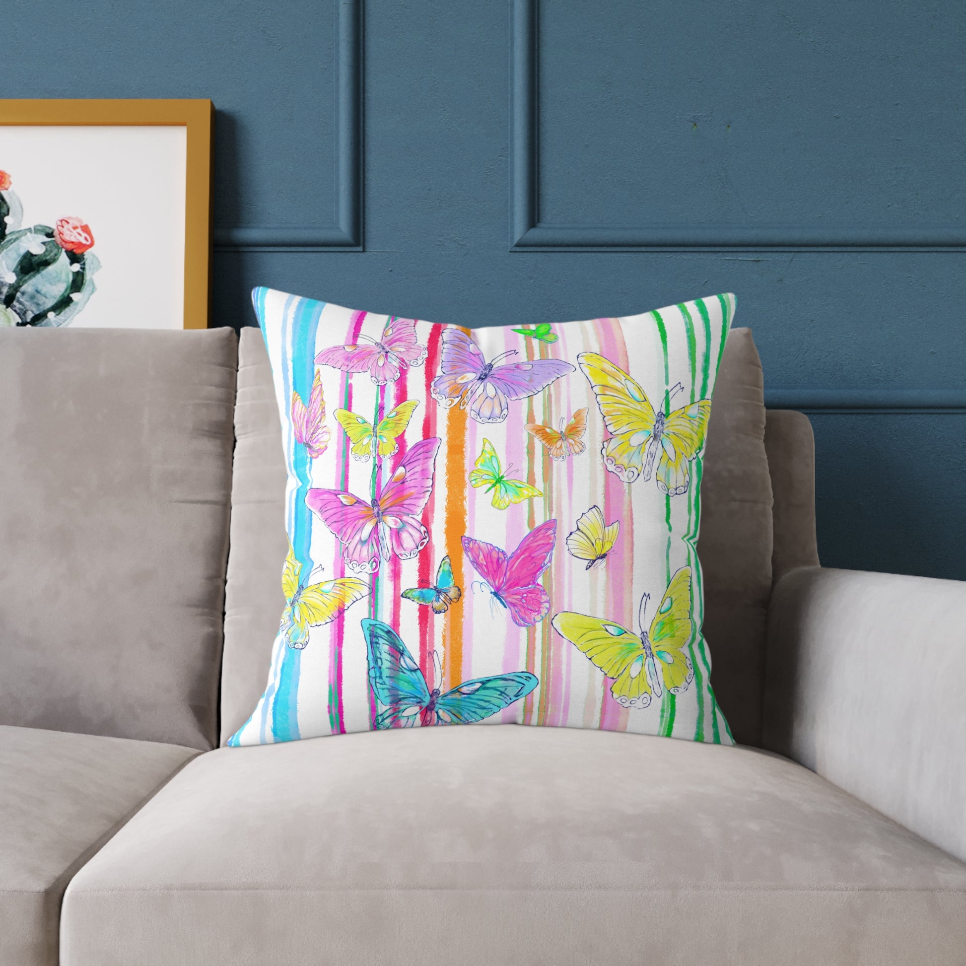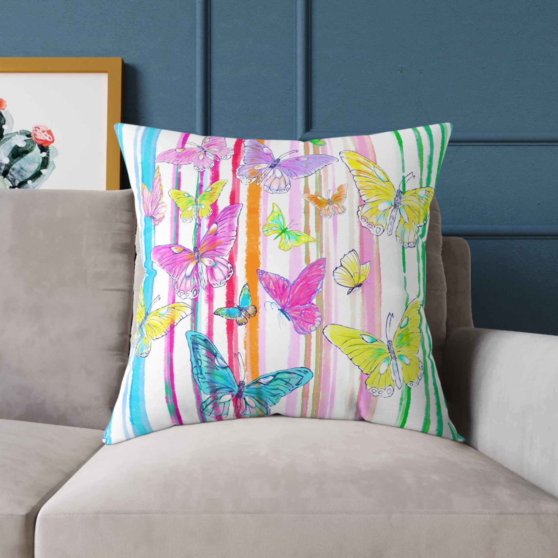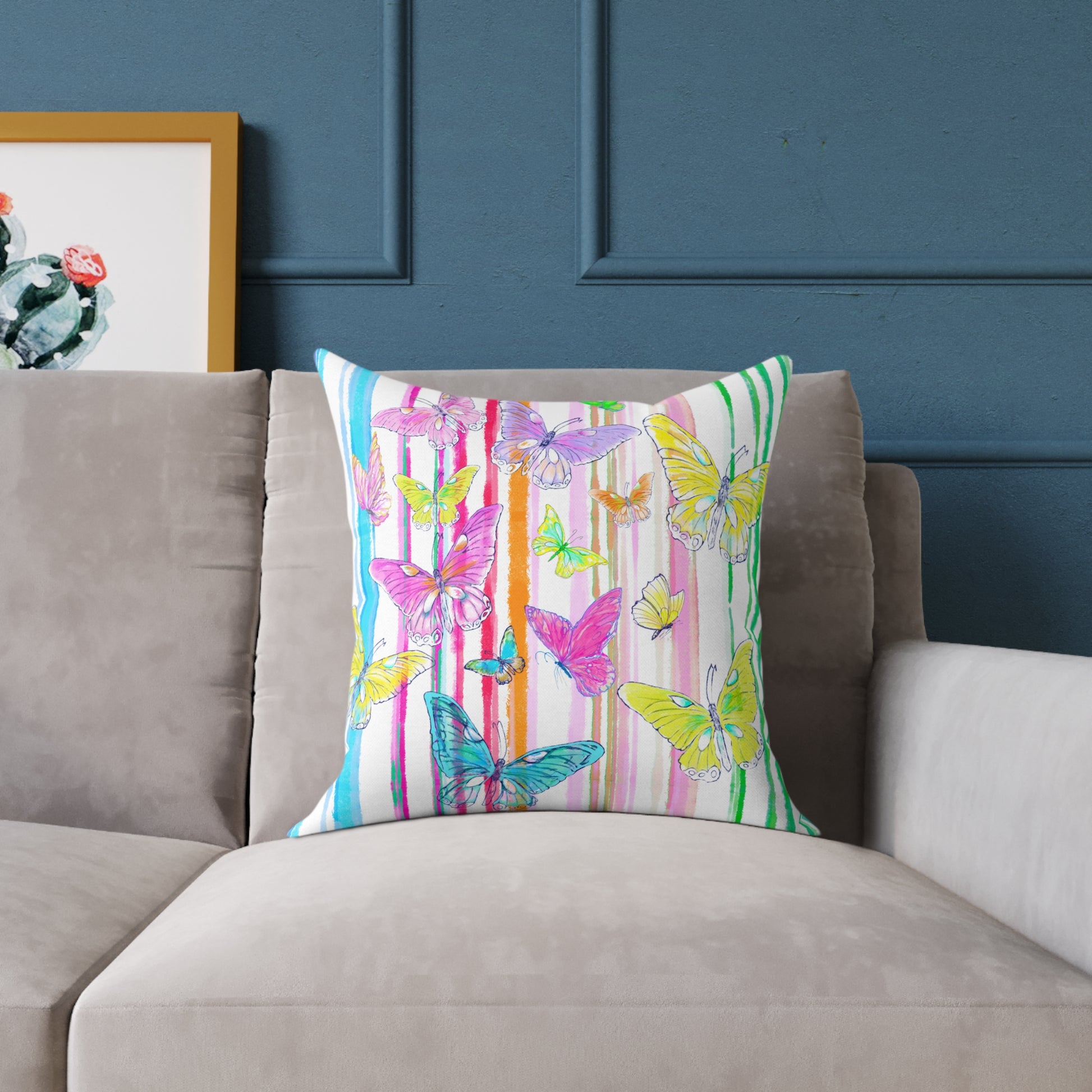 Let your home bloom with the quiet wonder of hand-drawn butterflies by local artist Joel, gently entangled in a tangle of color and movement. One side of this pillow features soft watercolor stripes, the other a whimsical gathering of butterflies in flight—designed to bring cheer, color, and calm to your most cherished spaces.