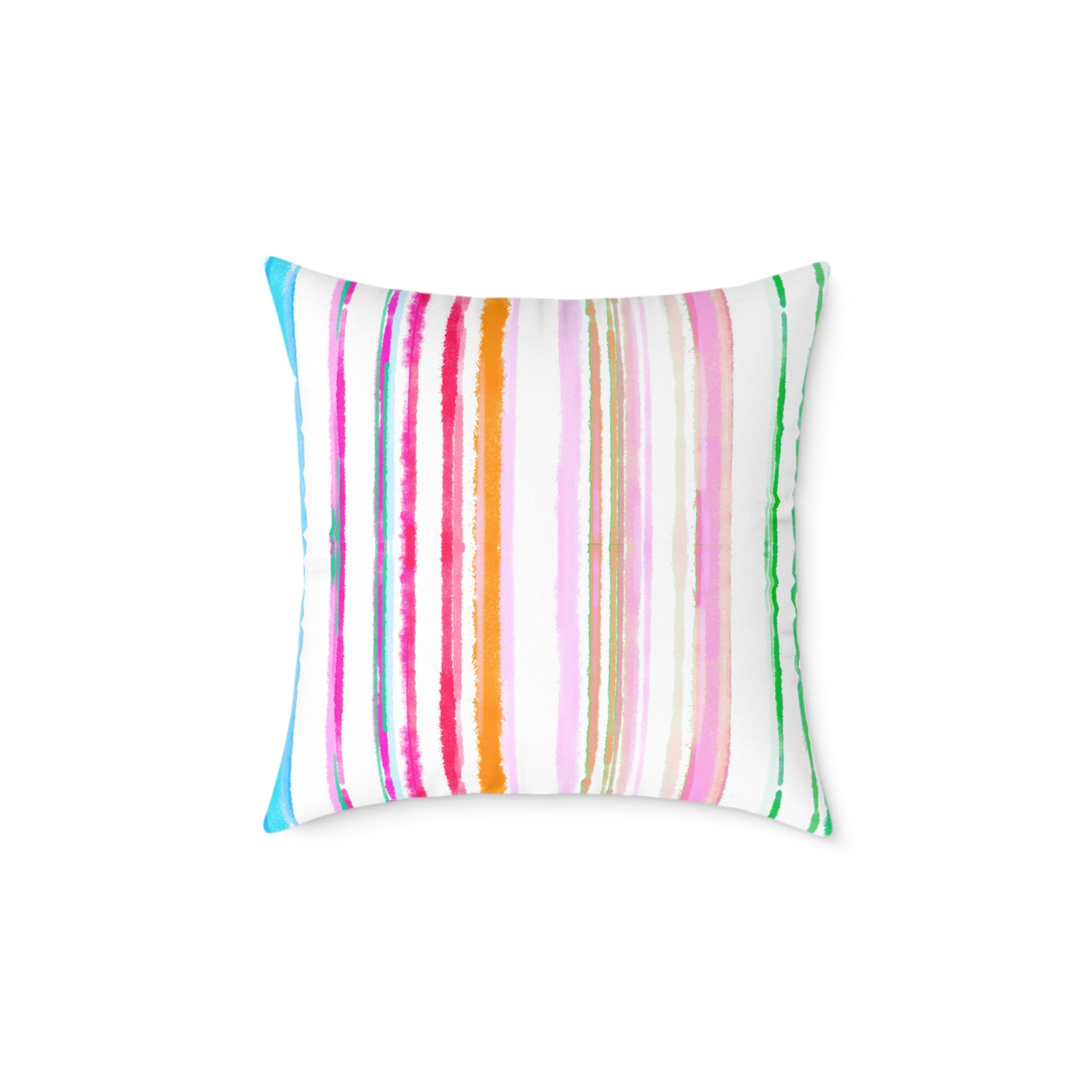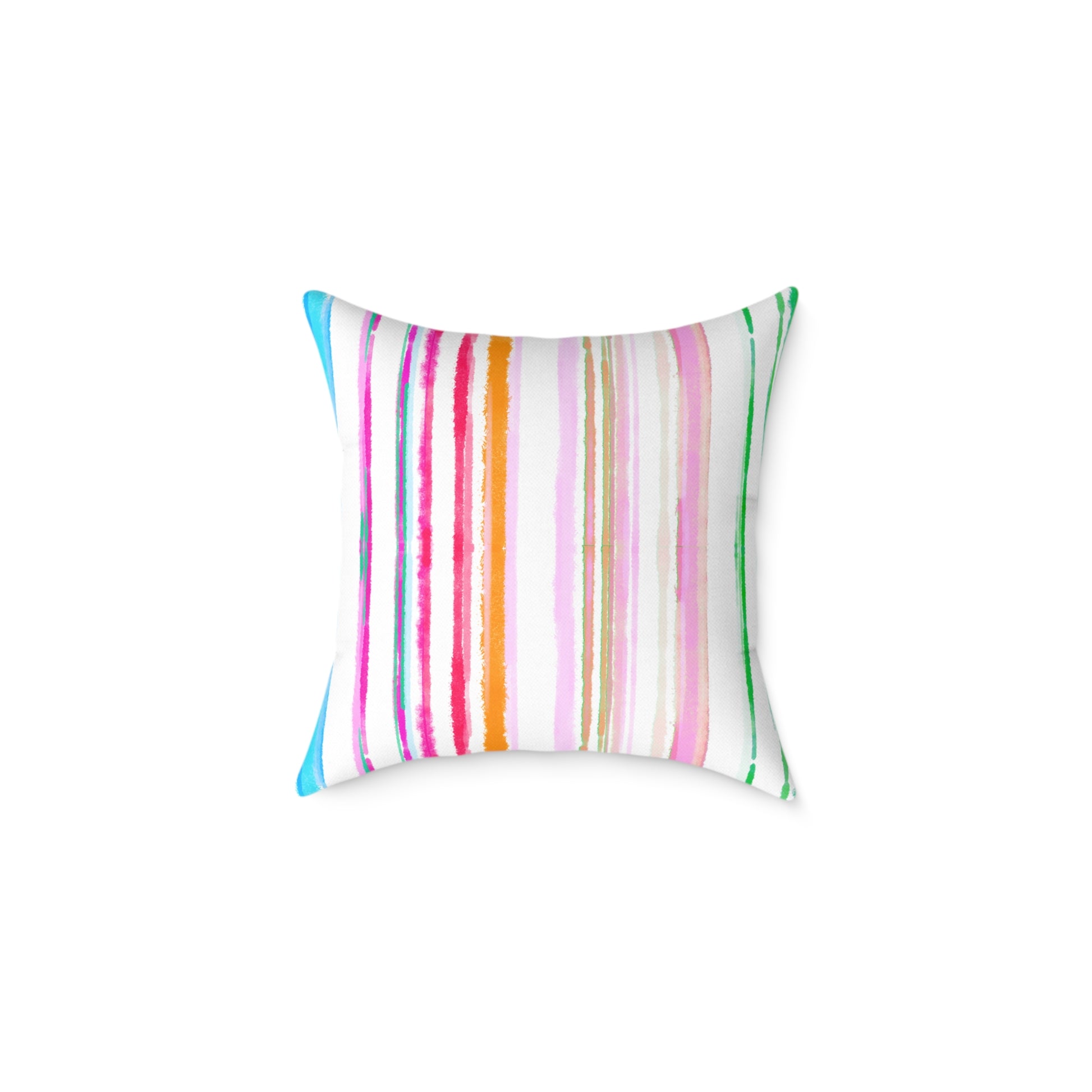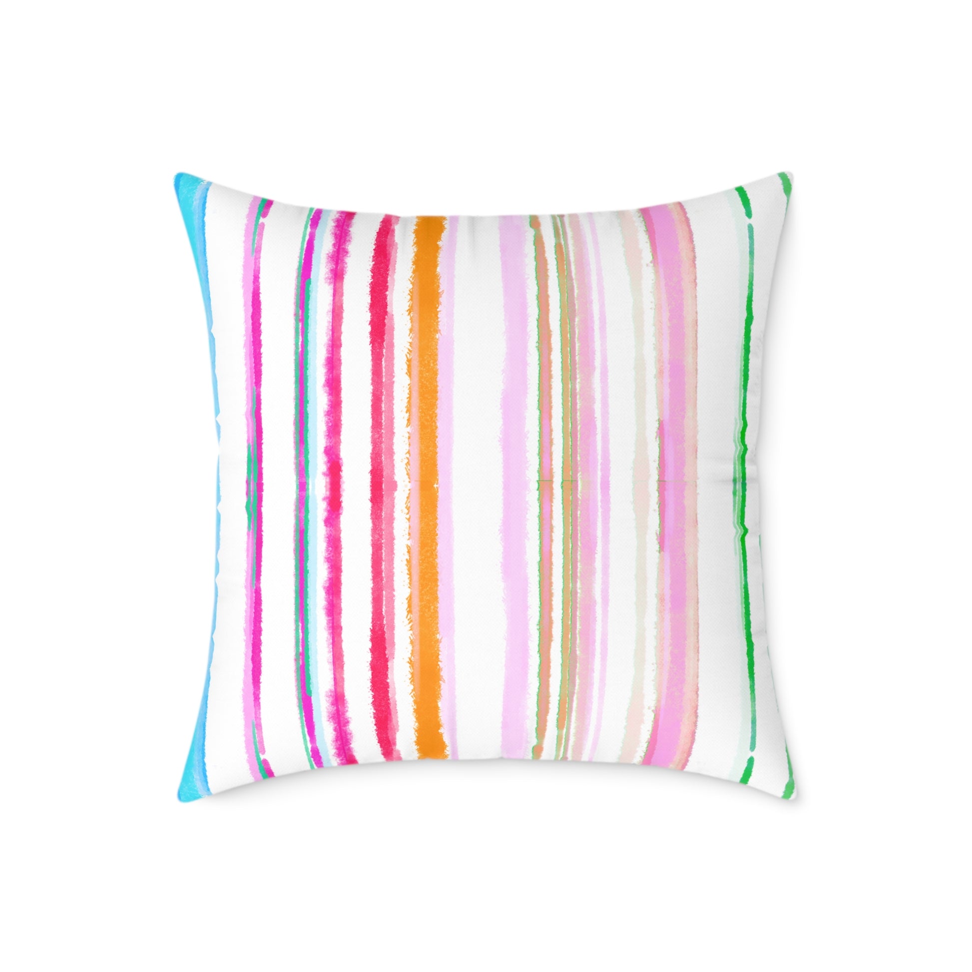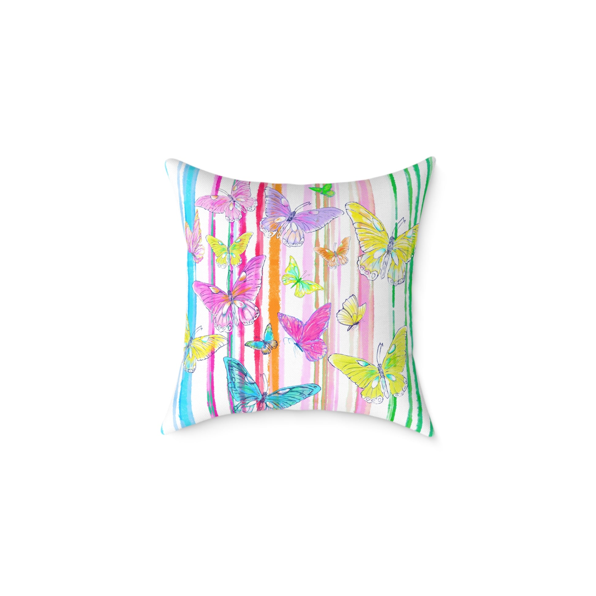 Let your home bloom with the quiet wonder of hand-drawn butterflies by local artist Joel, gently entangled in a tangle of color and movement. One side of this pillow features soft watercolor stripes, the other a whimsical gathering of butterflies in flight—designed to bring cheer, color, and calm to your most cherished spaces.