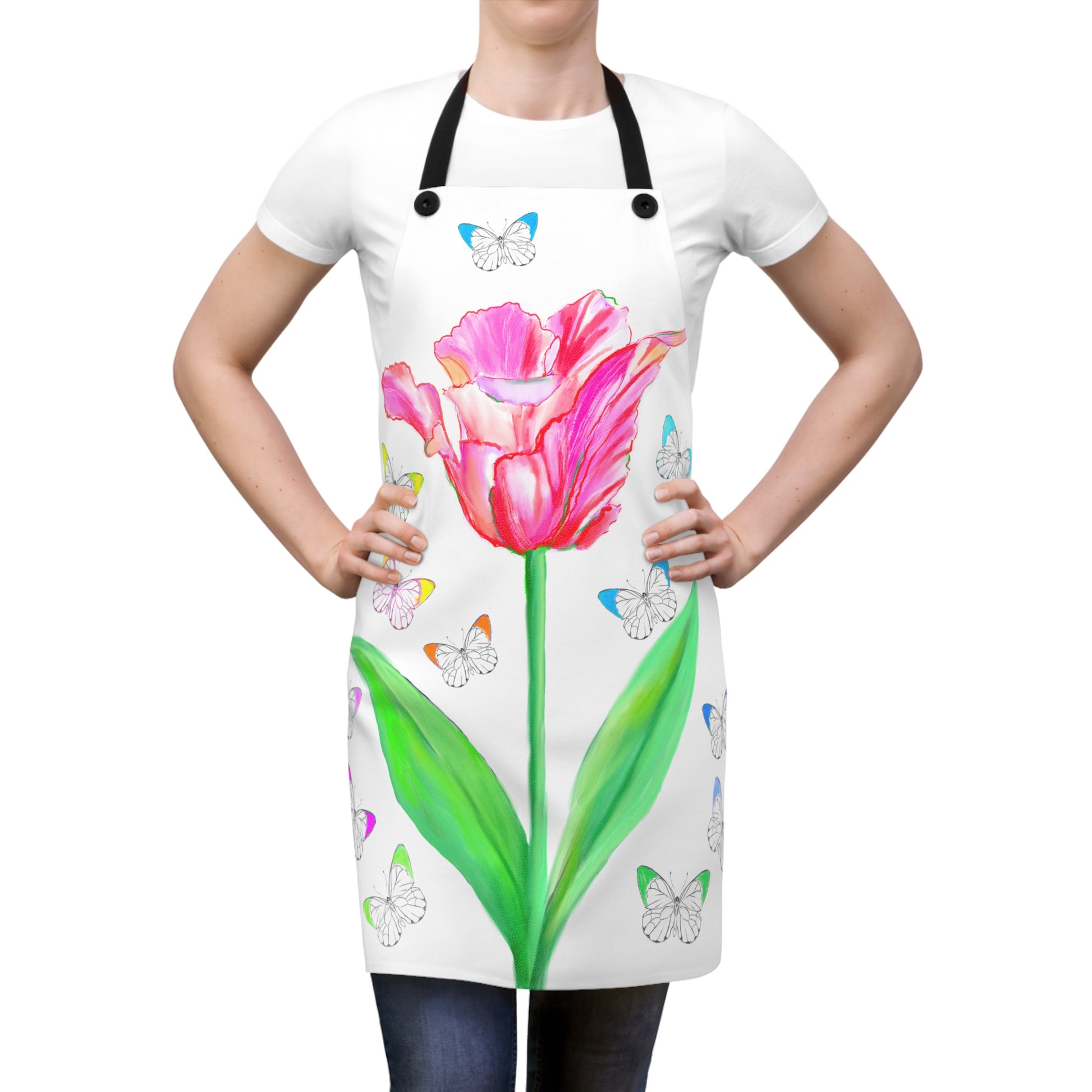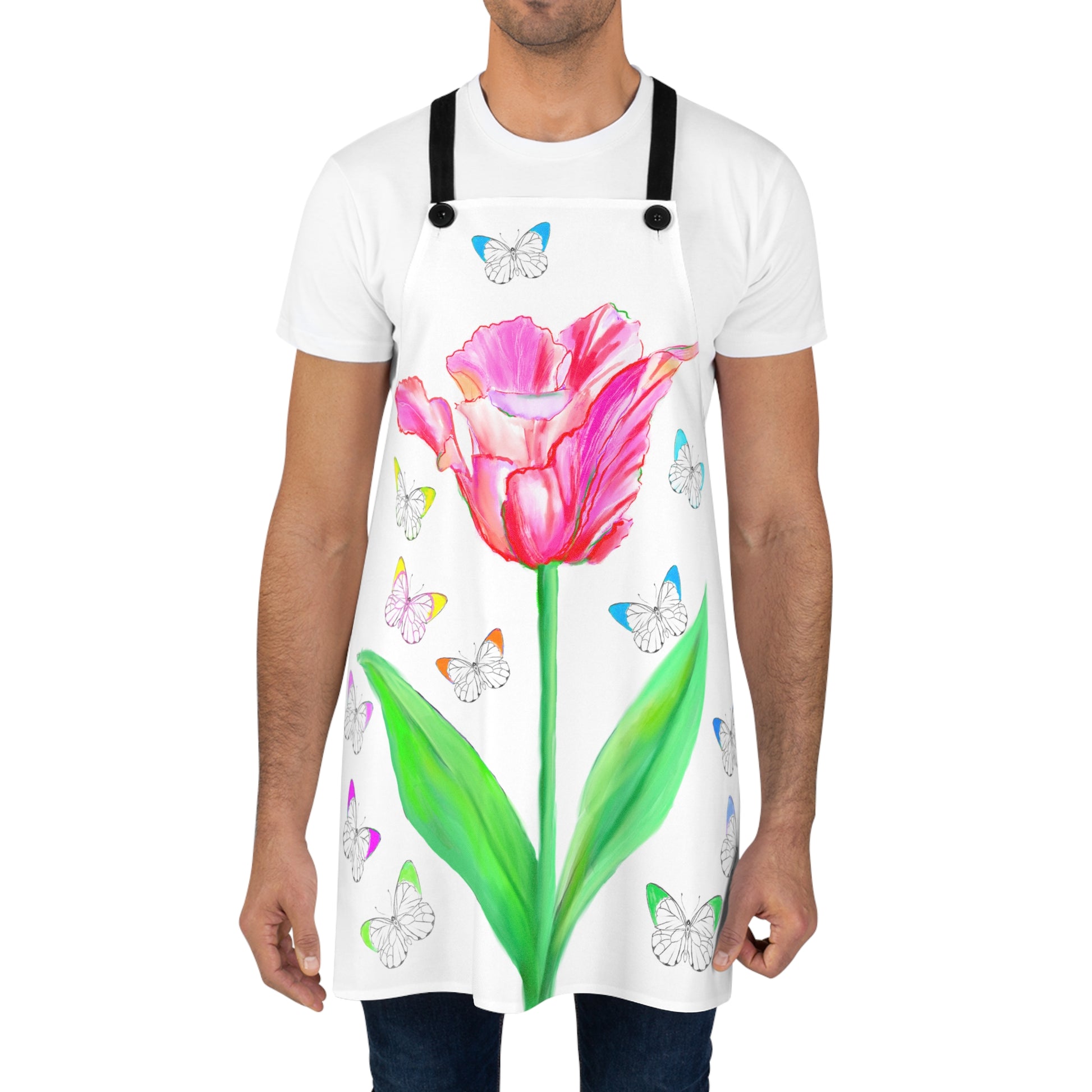 For all who adore tulips and the refreshing colors of spring, this hand-drawn apron by local artist Lois is a cheerful embrace of the seasonâno matter what the calendar says. With its vibrant, painterly tulips and soft breeze of color, it's a piece of wearable art that brings warmth and joy to the heart of any kitchen.
