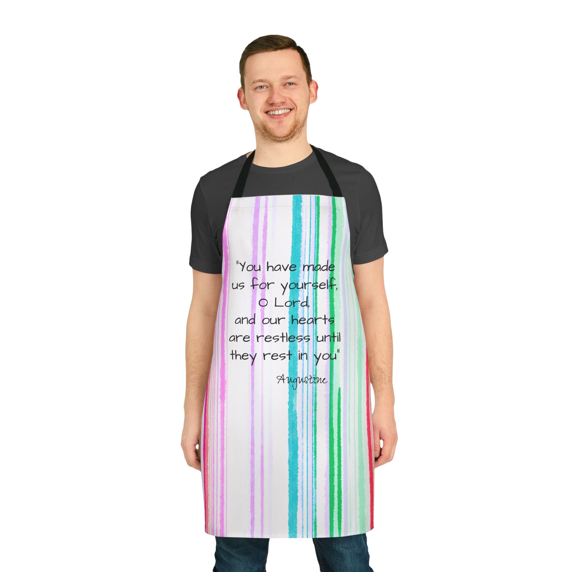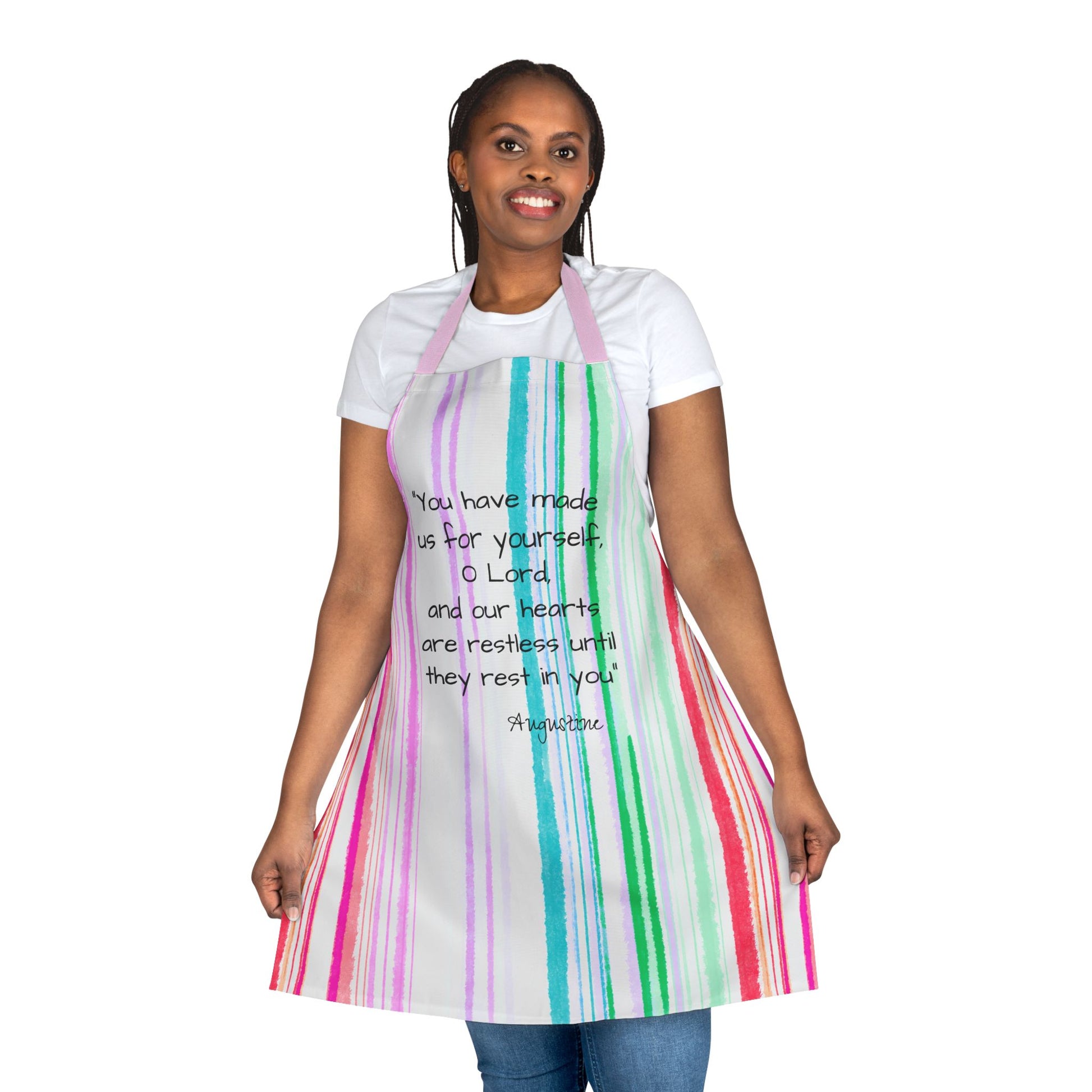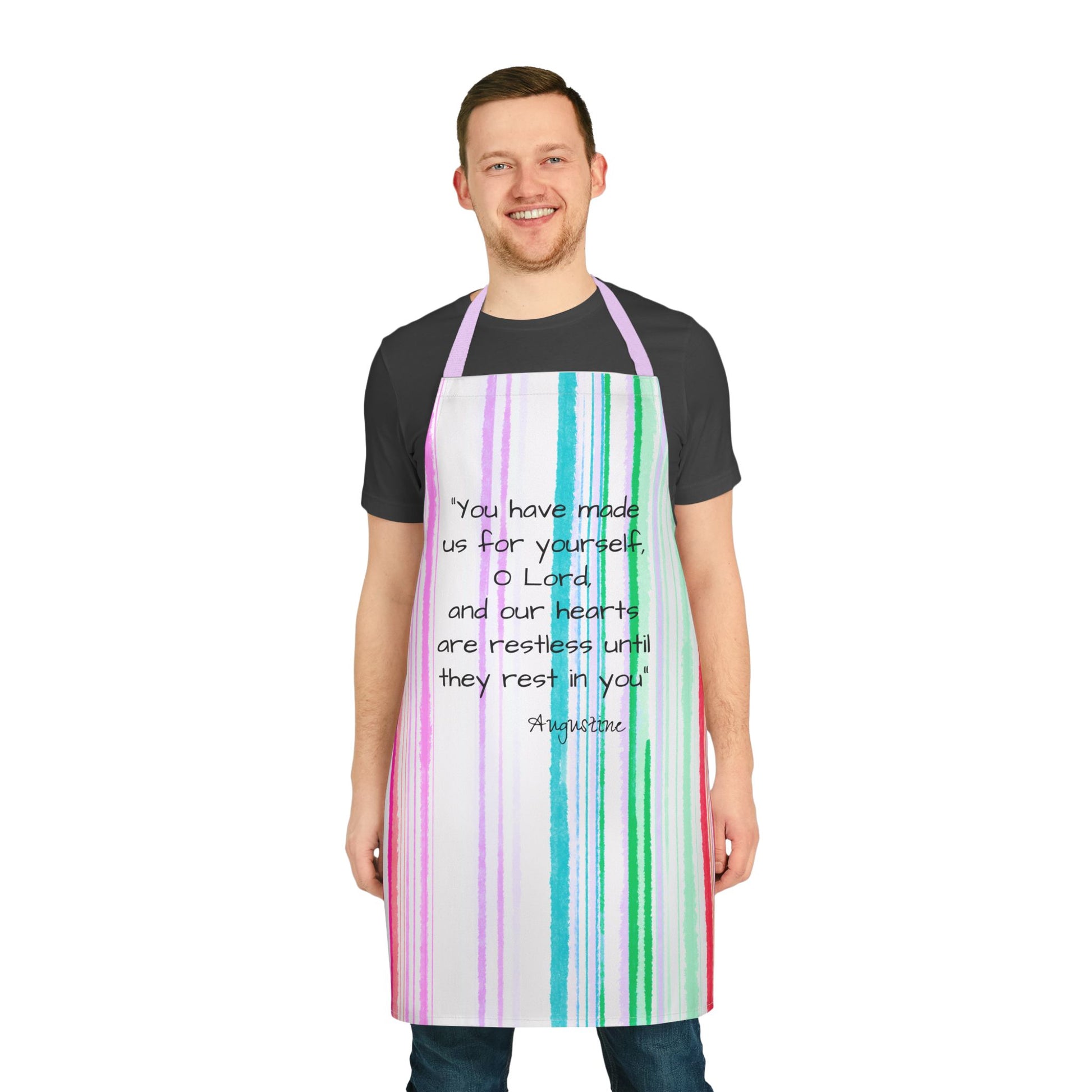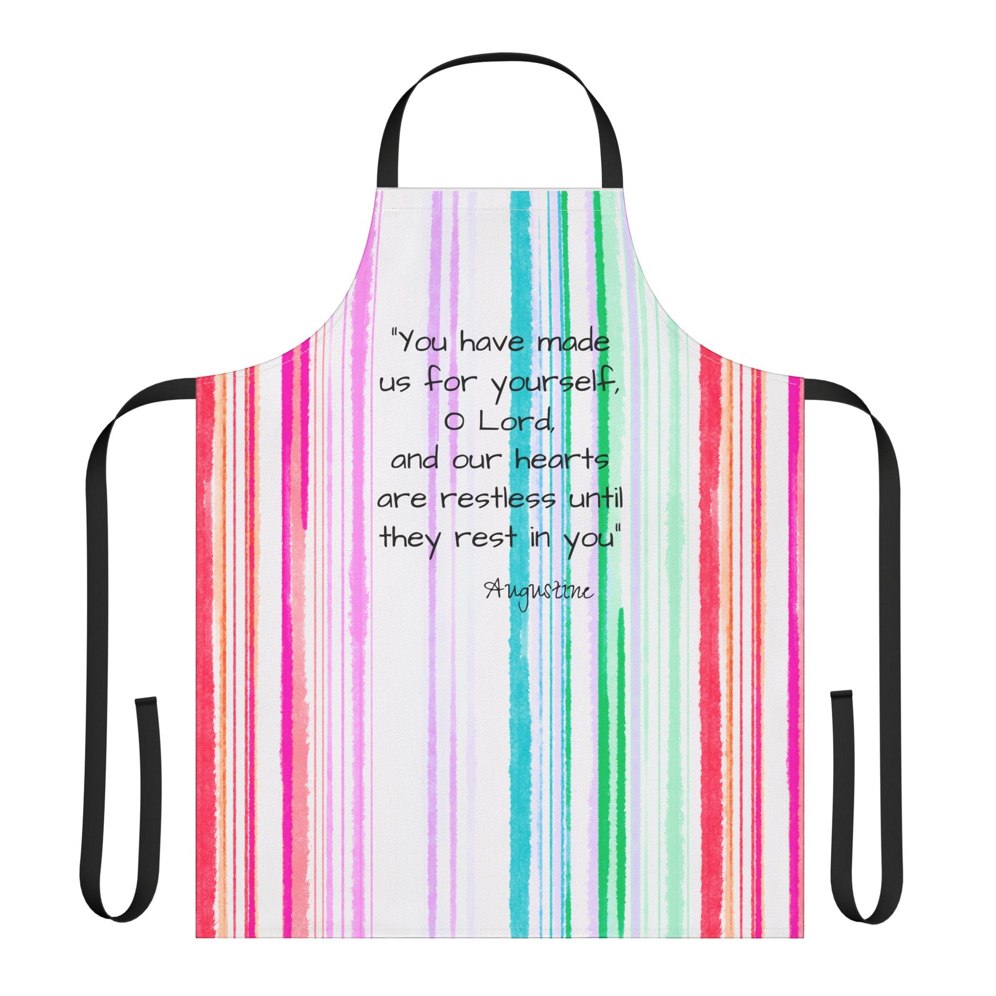 Let your time in the kitchen become a moment of beauty and meaning with this hand-painted striped apron from Periwinkles Design. Adorned with one of St. Augustine’s most beloved truths—“Our hearts are restless until they rest in You”—this apron expresses the deep spiritual reality that we are made for communion with God, and true peace and fulfillment are found in Him alone.