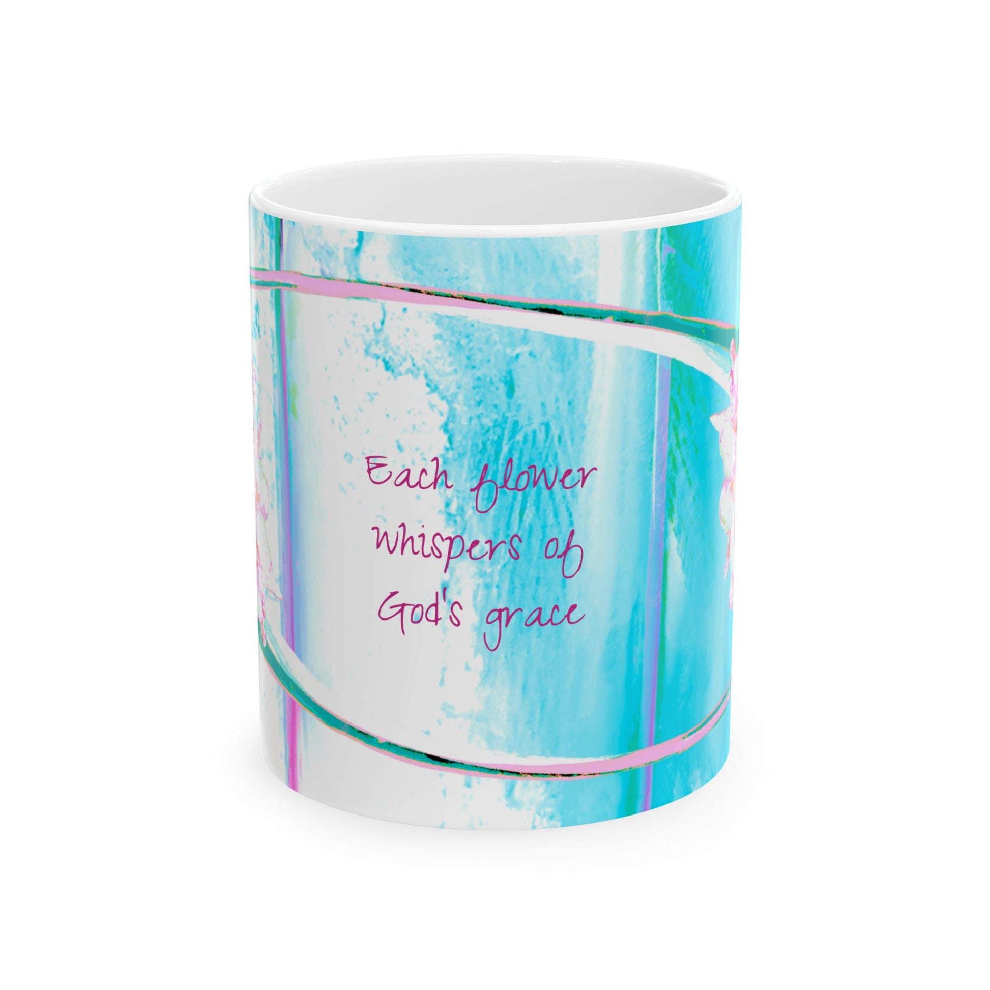 Zinnia Ceramic Mug Aqua,Raspberry "Each flower whispers of God's grace"