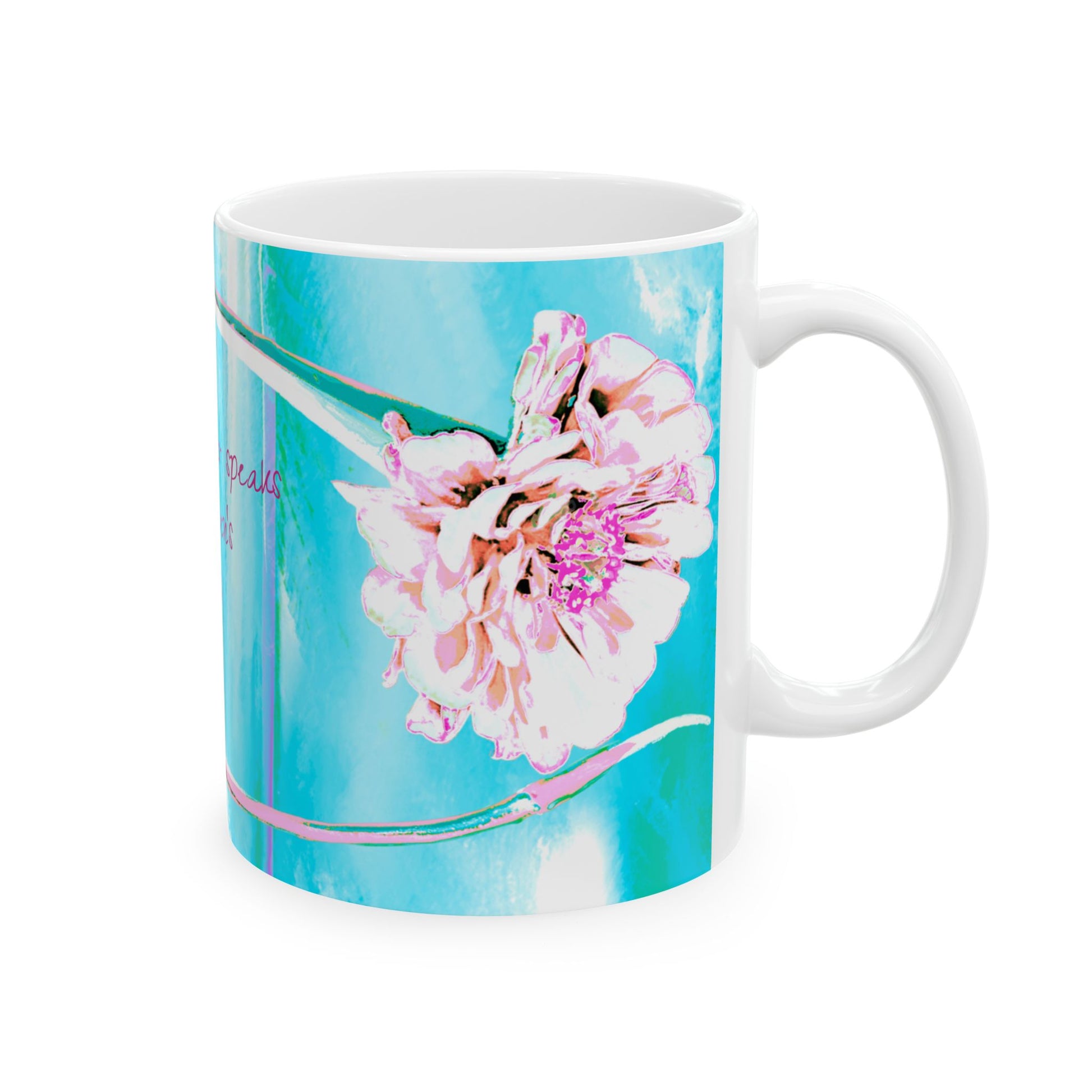 Zinnia Ceramic Mugs Aqua Raspberry "Every flower speaks of heaven's joy"