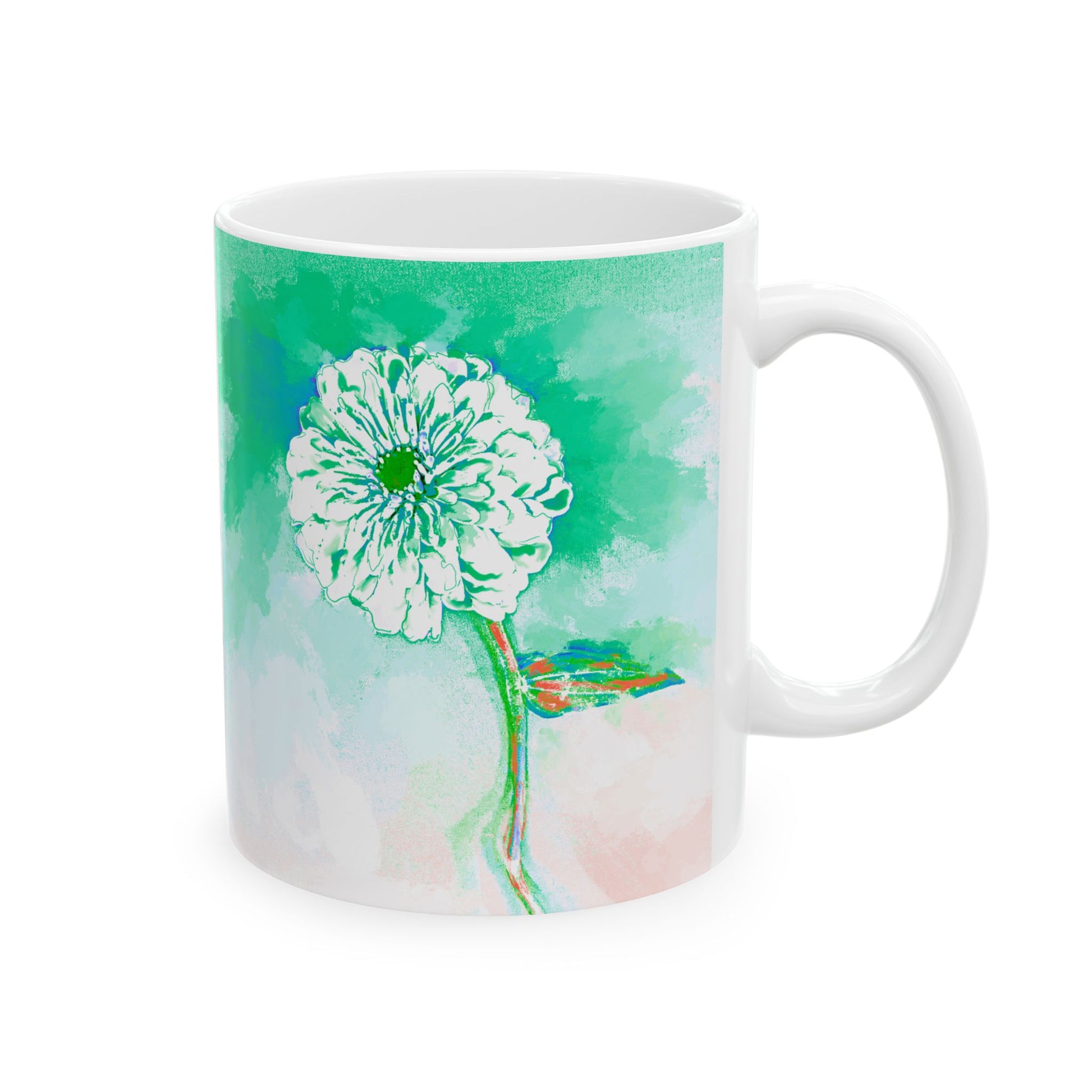 🌼 Periwinkles Design – “Abstract Zinnias & Conversation” Ceramic Mug