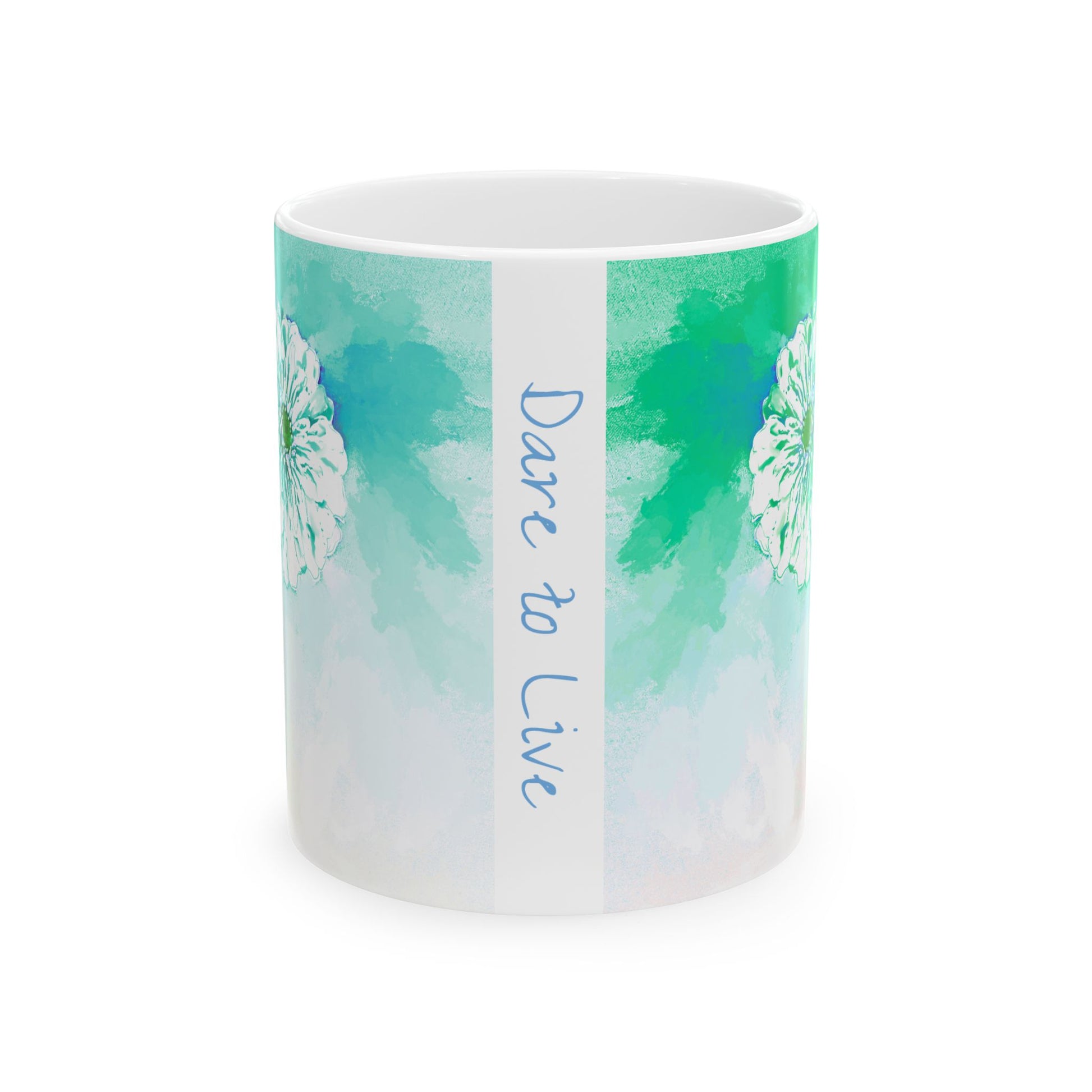 Zinnia Color Splash Mug Blue Green “Dare to Live”